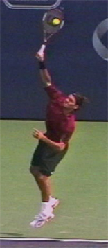 Let's keep going now and see what the high speed footage shows us about some of the other key aspects in his motion. In this second article, we'll take a look at Roger's tossing motion, how he positions the ball at contact, and his speed/spin combinations. Then we'll look at his torso rotation, his leg action and his followthrough. Again, the high speed video shows that on these elements Federer is a beautiful technical model for most severs.