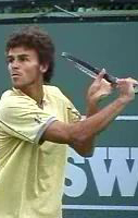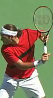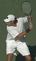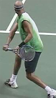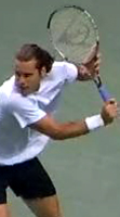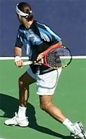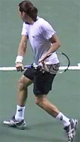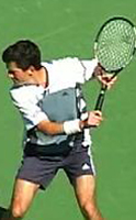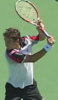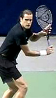 Robredo starts back on a diagonal, and continues upward until he reaches the extreme position at the top of his backswing noted above. Gustavo Kuerten also takes his hand back on a steep diagonal to the highest position of any player, but as we saw, tilts the racket tip backwards and keeps it below head level.