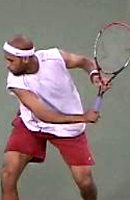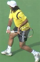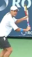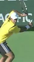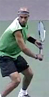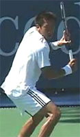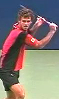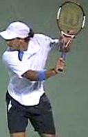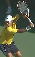 Fernando Gonzales, also with an extreme grip, breaks the pattern of upward diagonal movement, and actually does something similar to Philippoussis. He starts the racket straight back, but bends his elbow and raises his hand dramatically at the end to match the height of Robredo. But unlike Philippoussis who keeps his hand in closer, Gonzo simultaneously takes his hand out further to his side, again similar to Tommy at the top of the backswing.