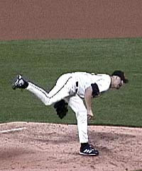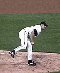 Compare this to Jason's leg. There is a long, almost lazy cross step forward and across his body with his back foot, the natural effect of the continuing momentum of his delivery. Unlike Pete, who takes this step as part of a movement pattern forward, the step for the pitcher is a natural consequence of the delivery. For the tennis player, stepping through the motion in any way that approximates the pitch is a technical kiss of death.