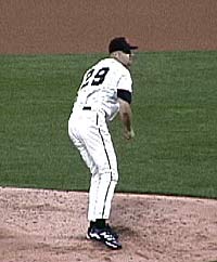 During the wind up the pitcher raises his front leg, bends his knee, and brings his thigh back almost to his chest. He then takes a gigantic step forward and plants virtually all his weight on the front foot just prior to the release. The back foot remains back, far behind the front, and is also on the ground. The width of his stance at this point can be 5 feet or more.