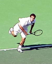 Note how Pete makes contact in the air. This is the difference in the role of the legs. The uncoiling is driving his entire body and his arm and racquet upward toward the ball.