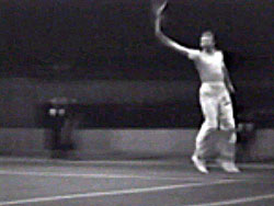 Footwork Budge assumed a sideways position with his right shoulder pointing toward the net for as long as possible. At the beginning of the stroke, the weight is on the rear foot then shifted to the front foot as the racket comes through. Very often, Budge would become airborne on his follow-through, an indication of the tremendous body weight he applied to the ball. The Racket Swing All great tennis strokes come naturally to players fortunate enough to possess them. Thought is replaced by instinct. Budge's backhand was a beautiful example. |