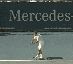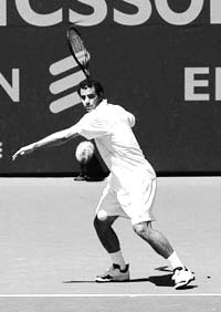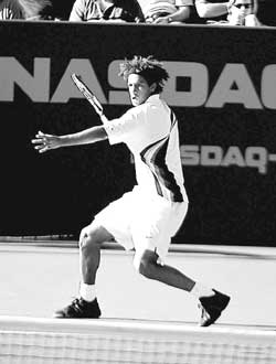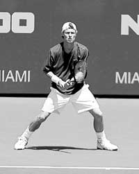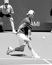 Lleyton Hewitt displays a low center of gravity distributed over his base as he lands from his split step. He maintains good upper body posture as he approaches the ball. Note his beautiful balance and wide base of support, with knees bent and his head pointing toward the hitting zone. |