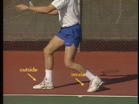 For a right handed player, the Outside Foot will be the right foot on a forehand, that is, the foot closer to the ball. The Inside Foot for a right-handed forehand, will be the left foot, the foot further from the ball.