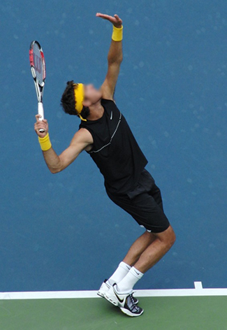 In this stage, the racquet accelerates up to the impact in less than 1/100 of a second for professional players, according to research (1). This stage should literally occur in the blink of an eye when performed correctly. It is important to accelerate upwards with the racquet and wrist on edge, pronating the forearm just before impact. Many players incorrectly accelerate upwards with an open palm, which indicates early pronation. Some players open their shoulders too early during this stage, which is another common problem. Says Kovacs, "The speed of back hip drive has the strongest correlation to maximum power delivery."