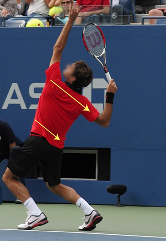 The cocking phase requires a good range of motion (ROM) in the shoulder and spine. Mark Kovacs says that the best servers in the world demonstrate tremendous thoracic mobility. According to Kovacs, "The lower spine should be stable and the upper thoracic spine needs to be flexible. That's the key. So there is a back arch on the pro serve, but not in the lower back " (citation). Bruce Elliott has shown that more range of motion during the racquet drop generates more racquet head speed (7). Poor cocking indicates a need for stretching and mobility training, which can dramatically improve power production. The Kovacs Institute offers many research based programs available online to help improve strength and ROM to improve the serve, and I recommend them