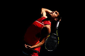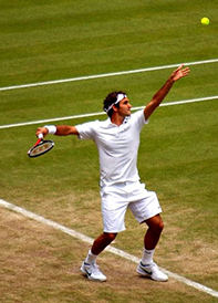 The cocking stage describes the moment where the shoulder reaches its point of maximal external rotation in the racquet drop behind the back. The most important aspect of the cocking stage is sequencing the leg drive with the racquet drop and acceleration. The legs should initiate the racquet drop and acceleration rather than the other way around. Dr. Brian Gordon has shown through high-speed video study that, in high level servers, the leg drive upwards starts before the racquet drops down behind the back. Gordon has also demonstrated that most junior and recreational players do the opposite: They drop the racquet before firing the legs upward. Girard and colleagues have demonstrated that advanced servers initiate the leg drive sooner than lower level servers (6). The result of a late leg drive is a loss of power because the stretch-shortening cycle is not optimized to enhance elastic energy return from the tendons in the shoulder and arm complex (8).