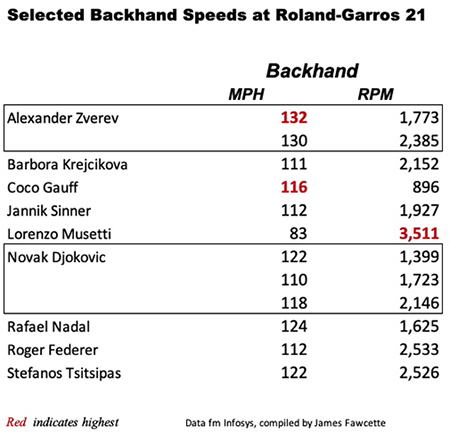 Both the fastest forehand and the two fastest backhands at Roland Garros this year were struck by the 6' 6" Alexander Zverev in his semifinal loss to Stefanos Tsitsipas -- a 136 MPH forehand in the second set and then in their third set a 132 MPH and a 130 MPH backhand.