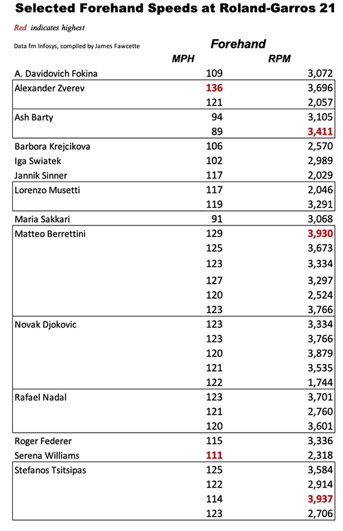 One forehand was recorded at a startling 136 MPH. Backhands also reached new levels. And women's speeds have also shown an increase, although the changes there are more in the levels of spin than sheer velocity.