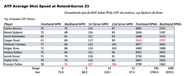 The top 10 men, headed by Carlos Alcaraz, averaged 75.6 MPH on their forehands, almost identical to the top men at the French in 2021. The range of forehand speeds from the slowest surprisingly, to me anyway, by Holger Rune was the lowest at 72 MPH. Caspar Ruud was the highest at 80 MPH