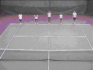 Start sideways in your tennis ready position. Side shuffle to the net and then side shuffle back to the baseline.