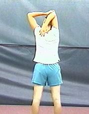 Stand with your arms overhead, holding the right elbow with the left hand. Use your left hand to pull the right elbow behind your head. Hold your elbow in this position, and bend your trunk to the left side. Repeat on the opposite side.