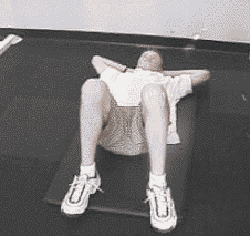 Exercise: Lie on your back ith your feet on a bench. Your hands are behind your head with the elbows to the side. Curl your upper body and move your chest up towards your thighs as far as possible. Again, don't pull your head forward with the hands.