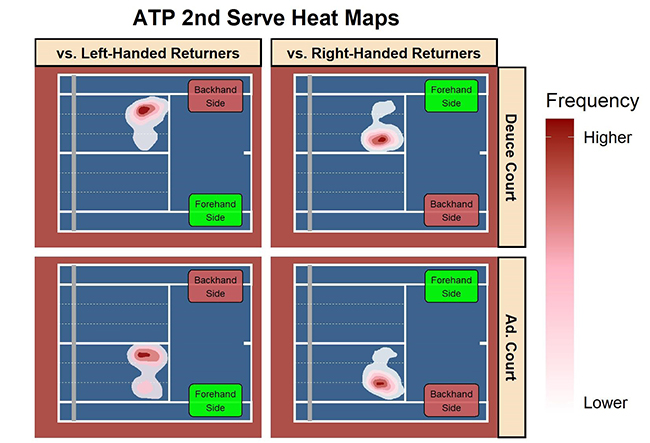 By splitting the second serve maps against returner handedness, we see clearly that players overtly target the backhand side. This is shown with more wide serves on Deuce and T serves in the ad court against lefty returners, and the mirror opposite for right-handers.