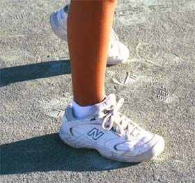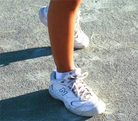 The front foot (the left foot on a right-handed forehand) is the "anchor foot." The position and the angle of the toes of the anchor foot on the forward step is very important.
