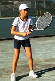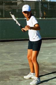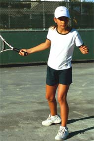 The ready position is the starting point for the groundstrokes. The key to a good ready position is to be in a posture of alertness and balance which will enable you to react quickly to your opponent's shot. Note that the hands are held in the middle of the body so that you can turn equally well for a forehand or backhand. As you advance, you will add to the ready position a little ready hop or "split step" just as your opponent is striking the ball. The split step helps you react more quickly to the ball.