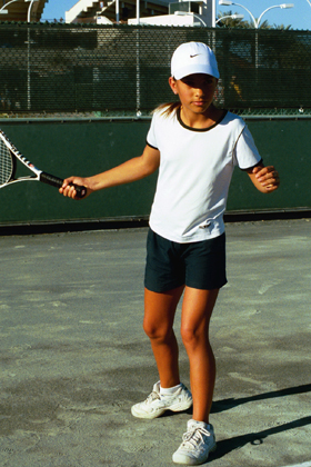 The hand can point to the oncoming ball, or come partly across the body. As players advance, this left arm stretch will increase.