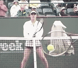 We sometimes call this "catching" the ball and this is not uncommon advice for volleying. Catching, however, is not as simple as it seems, especially when it involves a fast moving bouncy ball on a springy tennis racquet. I play catch with my dog using a tennis ball and my dog (a Border Collie/Aussie mix) is a magnificent example of coordination and athleticism. As incredible an athlete as she is, catching the ball is a random act for her. More often than not the ball ricochets out of her snapping jaws like some berserk projectile. I watch her make that stabbing action at the ball and I think to myself, "How many times have I seen that volley on a tennis court." Sadly there is no one to blame but the teachers who tell people to keep a firm wrist, block the ball, step out to the ball, don't swing, or (worst of all) punch the ball.