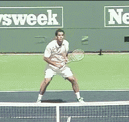 Sampras (left) shows perfect volley technique. Racquet positioning on the upper, outside edge of ball and forearm rotation absorb pace while feet move the body forward and shoulder extends to provide positive follow. These carefully modulated forces combine to produce precision "lagging" of the ball.