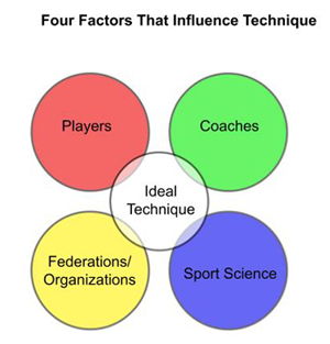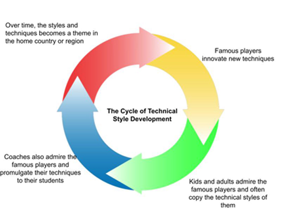My belief is that in countries and regions around the world throughout history, there are three primary influences of technique, viz., famous players, coaching leaders, and national federations/teaching organizations that certify and train coaches.