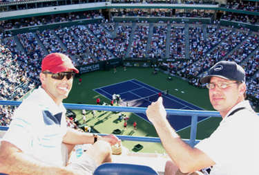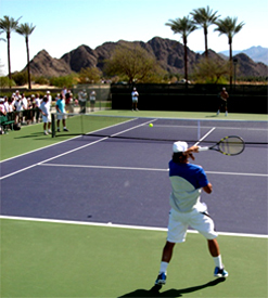 For example, we broke the forehand down into 3 key positions: the turn, the hitting arm position, and the extension of the swing. We looked at how these elements run through all the pro forehands, from the classic to the extreme grips. We also looked at hand and arm rotation or the "windshield wiper" and saw how that applied or didn't apply depending on the ball. We did the same for all the strokes, including the two-handed and one-handed backhand, the volleys and the serve. That presentation is also now the basis for a new series of articles on Tennisplayer. You can check out the first one on learning from the pro forehand in this issue. (Click Here.) The idea was to identify the actual physical positions in the strokes with clear checkpoints that our participants could then create for themselves on the court. And that's what we did starting the next morning. We went out on those beautiful red clay courts at the Parker and worked on executing the core elements in the swing patterns. Everyone also got the choice of one stroke for video analysis, so they could compare their execution to the model positions. Then at the end of the morning we headed out to the matches. The goal was now to reinforce everything we'd learned by watching and absorbing the same positions in the strokes of the top players. Everyone got a day ticket and an evening ticket for Saturday. Then we repeated the whole process on Sunday. Hit the courts in the morning, and then out to the Tennis Garden. I also gave everyone my own personal reviews of my 3 favorite desert restaurants, because, you know you have to eat sometime.