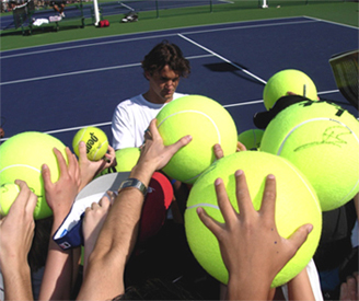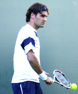 That's just one example of how it works, because the Pacific Life Open is an overflowing cornucopia of elite stroke production, with every technical and tactical style you can imagine. Who was out there over the first two days of the tournament? Well name any player in the top 50 (with the exception of a few of the women), and all of the exciting young players like Novak Djokovic, Andy Murray, Marcos Baghdatis, Richard Gasquet, Sam Querry, Anna Ivanovic, Anna Chadvatadze, and the list goes on. And oh yes, Roger. He was there too. No doubt the high point for our man Scott Murphy was standing there in the front row watching Roger on the practice courts, something quite of few of our guys were able to catch, including Bob Farese who documented it for us with the stills you see here. And we got to see Roger play his first match in the stadium. And his last match, as it turned out, a seemingly very surprising loss to Guillermo Canas. (Since Key Biscayne, where it happened again, it seems less surprising in retrospect.) Tennisplayer's digital still photographer Greg Swendsen--yes, another Osmosis attendee--was there to capture the emotional dynamics of a rare Roger loss. The result is a fascinating portrait of Roger in Defeat this month that you may want to check out as well. (Click Here.) You can learn something at pro events in many ways, and some of them are always unexpected, and that's a big part of the fun.