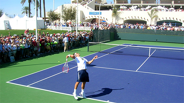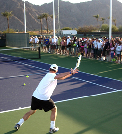 As I have written over the last couple of years, Indian Wells is an amazing wonderland for tennis lovers. The occasionally fickle desert weather cooperated incredibly well, with clear, hot days, warm nights, and no hail, desert winds, or sand storms. At the Tennis Garden, there are 3 main stadiums and 3 other outside show courts where most of the matches are played, so our guys were able to wander among them, as well as the practice courts. It was just beautiful out there, day and night. I guess Bob Farese was paying attention, because one of the amazing things about the digital pictures he sent me was that he perfectly captured some of the top players in the world in the precise key positions we identified in the presentations. Check it out.