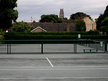 So there was no way I wasn't going to check that out, and I was amazed at what I found. That's where I got my first surprising impression of what is currently going on in English tennis. There is an amazing flood of tennis energy in England right now that you can feel everywhere, from the grassroots, to the high performance coaches at the Lawn Tennis Association, to the members and spectators at the All England Club. The result may or may not be the creation of future English Wimbledon champions--but I hope that it will. In a town with a population of around 50,000, the Boston Tennis Club has 1,000 members. They have 10 immaculate outdoor all weather courts, 4 gorgeous indoor courts, and 4 pristine har tru courts. Anyone else wish their club in the states had something approaching those facilities? Probably most impressive, the junior program is flourishing in cooperation with the local schools, with around 400 kids playing regularly. That's right 400. San Francisco, where I live, with 10 times that population, can probably claim half that number of real junior players. On yeah, I forgot to mention the total annual membership fees at the Old Boston Tennis Club--around $400 American annually. The people at the club were very down to earth and friendly. I felt welcomed as if I were already a member. I met the manager Frank Cammack, who gave me a complete tour and filled me on the growth of the club and the programs, and I hit twice with a great young pro there, Richard Cooke. But at the club I was still reminded why I'd come to Boston. They say you can see that cathedral where my ancestor preached from anywhere in Boston. Well, check out the picture and you'll see it's true. That's a view of the church from the har tru courts. But that wasn't the only freaky tennis/history connection in Boston. As I got to know people in town associated with the church and the history of the town, it turned out that Frank's brother John Cammack and his wife Judy headed the group studying the connections between the two Bostons and early American history. They were every bit as gracious to me as my new friends at the Boston Tennis Club. And get this, John, at age 80, still plays tennis regularly at the Boston Tennis Club.