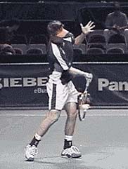 New School: Weight back. Hand grips and turns ball while weight shift is saved to drive ball instead of swing the racquet. Notice the similarity in all positions at contact in the examples cited in text. |