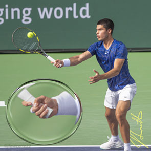 On the forehand wing, both Roger and Carlos, interestingly, have similar grip structures for their topspin strokes, closer to an eastern or composite eastern. In a personal interview, Antonio Cascales, founder and head of the JC Ferrero Equelite Academy where Alcaraz trains, says that Alcaraz has a conservative grip very close to Federer. That's important because it means that when Carlos attempts a drop shot he does not have to change his forehand grip much—if any—to facilitate the underspin shot.